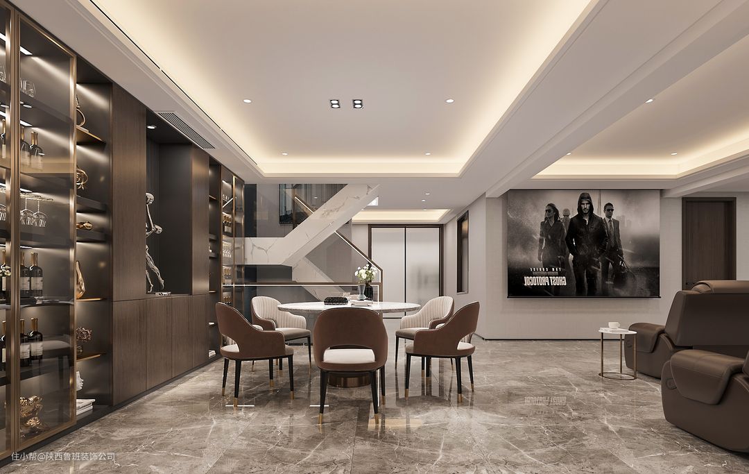 正式餐厅在地下一层,受采光影响,整洁干净是前提,将美感和收纳以及灯光发挥到了极致。灰色现代简约风靠椅与观影区沙发色相同,体现空间延续感,同时大理石桌面增添活力与温馨。简约的餐边柜和酒柜提升了空间的品质,搭配时尚的装饰品,一家人围桌而坐,在温馨用餐的同时也能感受现代艺术的熏陶。
