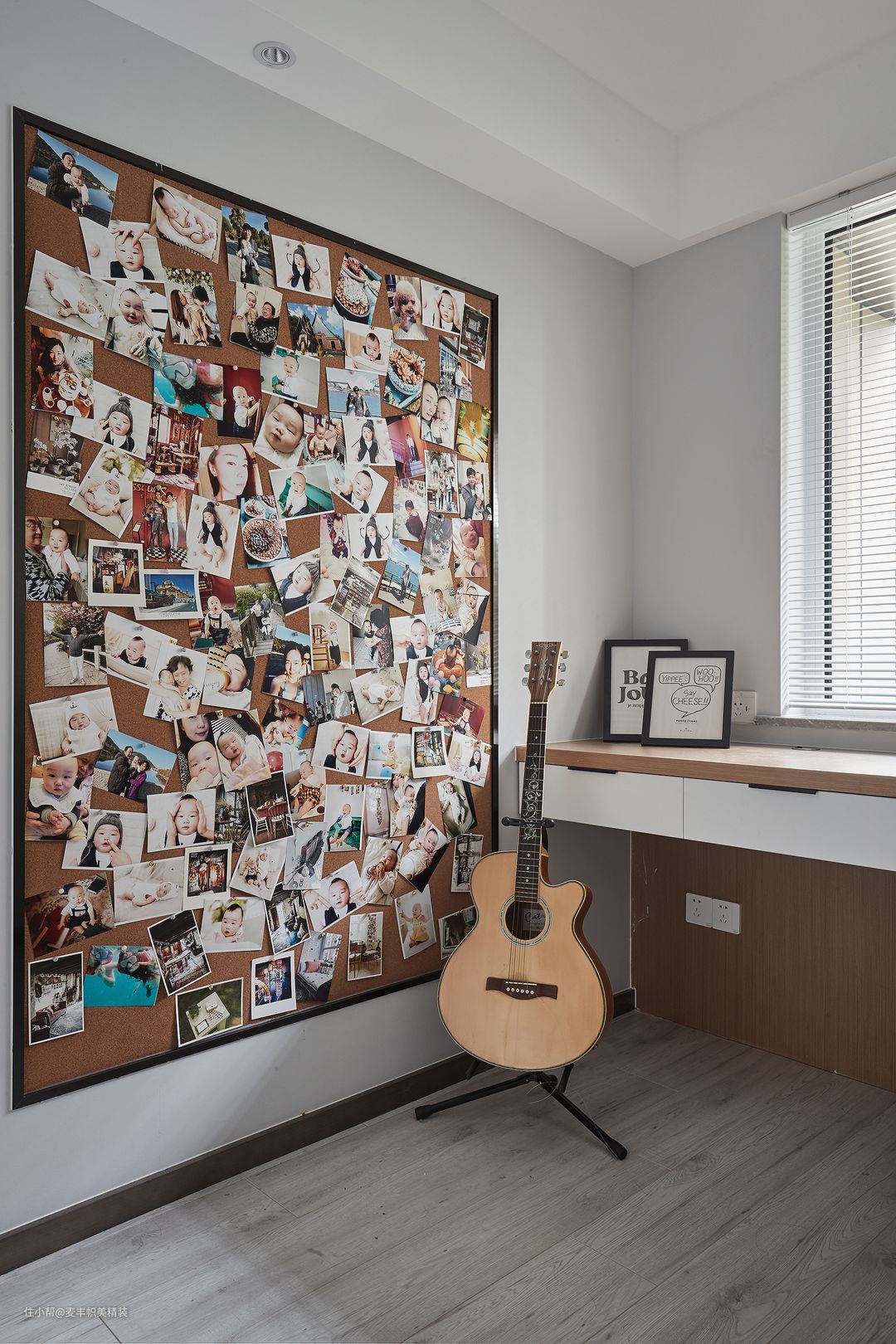 业主有记录生活的需求,此案采用的是褐色软布板,可以随心所欲的把照片钉在上面。后期这个房间会作为业主的工作间。