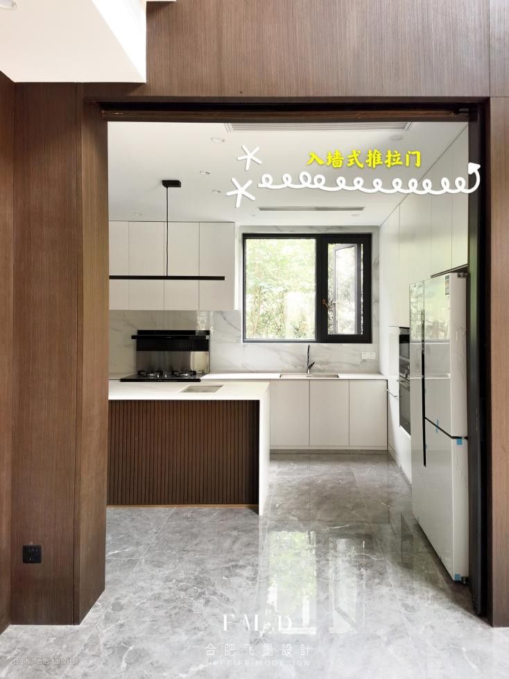 这么大的厨房,自然想维持视野开阔,首先第一步便是从门入手,入墙式推拉门,没有门套也没有地轨,装好之后往墙内一塞,在视觉上营造出高级简洁的质感。