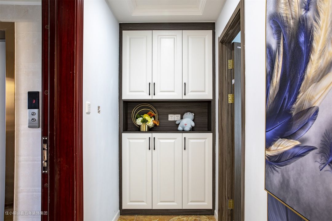 进门这里原本没有玄关柜,进出门换鞋不太方便,鞋子也扔的到处都是,后面设计师在进门左侧做了这样一面储物墙,不常穿的放进柜子里很方便。