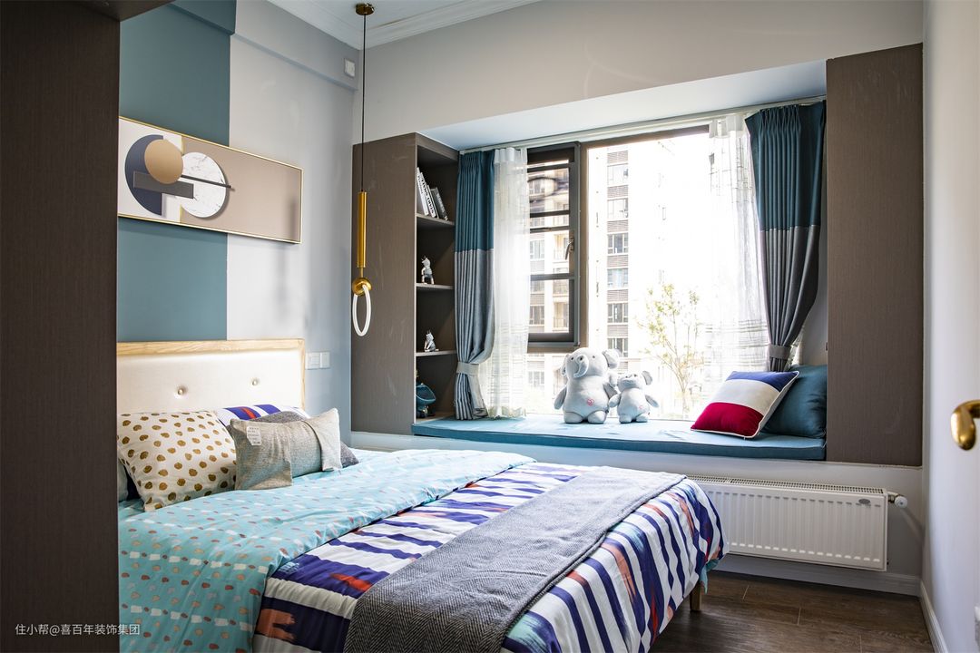 次卧是父母的房间,颜色选用蓝色和白色呼应,同样留出了飘窗做休闲区,侧边做到顶的一组储物柜。
