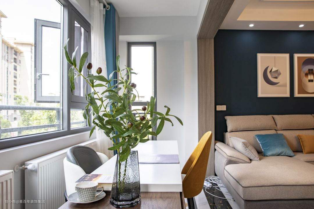 阳台纳入空间后做成休闲区,一张长方形拼接式的休闲桌,日常办公、看书或者邀约三五好友一起闲聊都很惬意舒服。