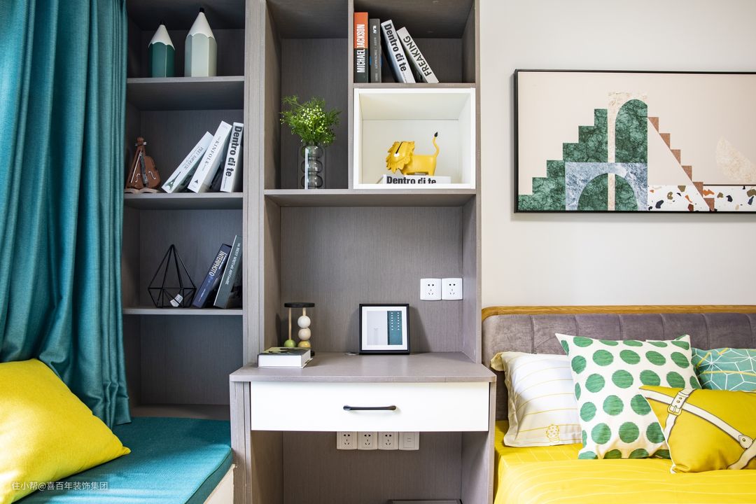 床头靠近飘窗部分放弃床头柜设计了一组小书桌,日常作为孩子学习看书的地方,桌子上下都设计了插座方便日常使用,家长可以坐在飘窗上辅导孩子。