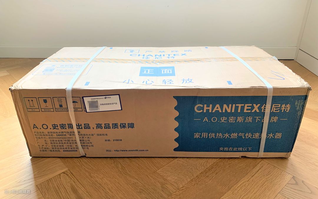 包装箱有打包带加固,外包装特别强调了佳尼特是A.O.史密斯旗下品牌。