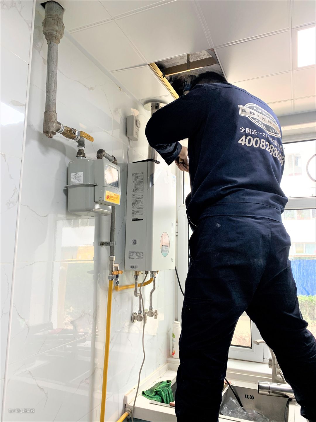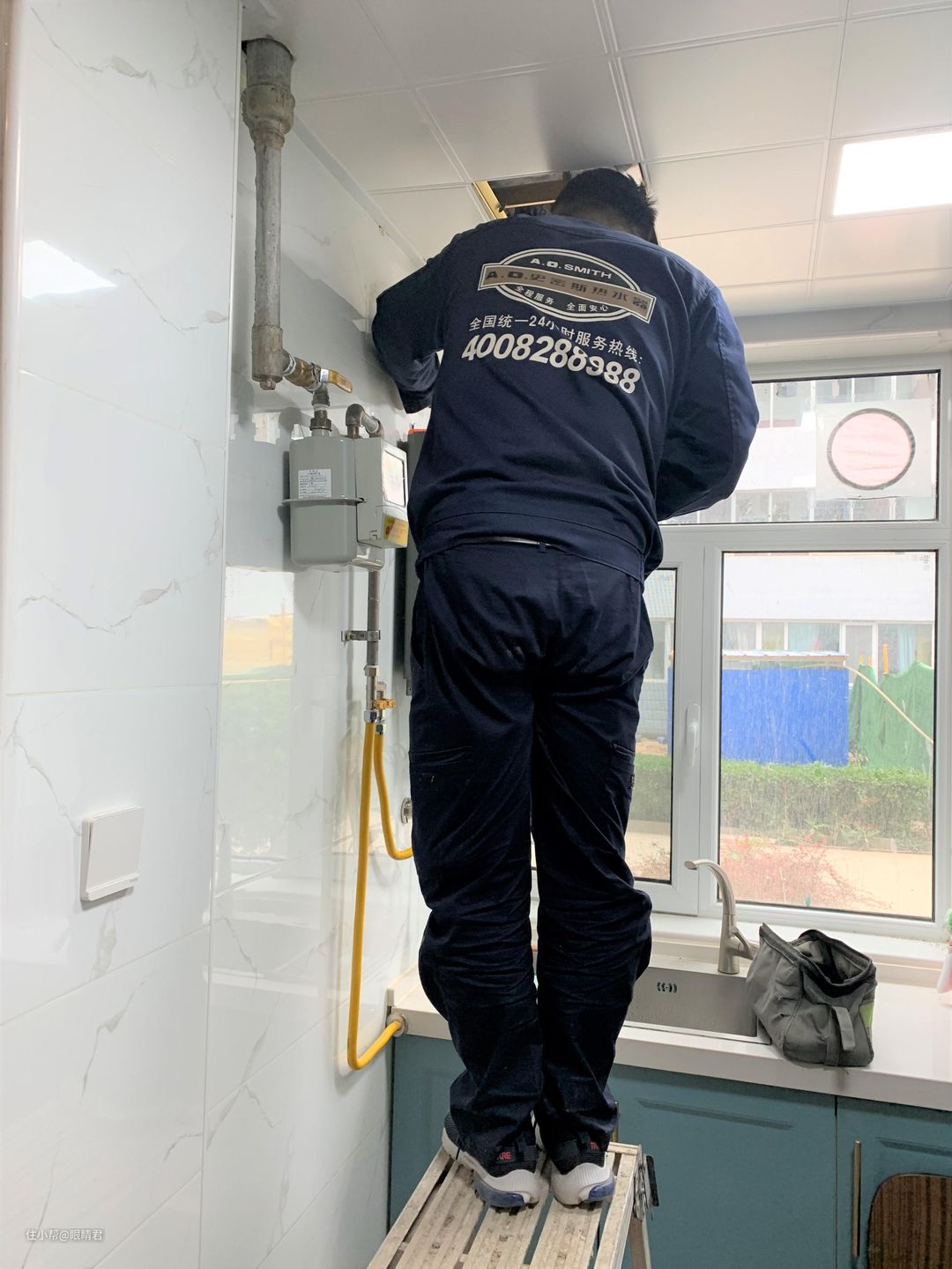 佳尼特共享A.O.史密斯的安装服务体系,所以安装师傅身穿的是A.O.史密斯的工服。