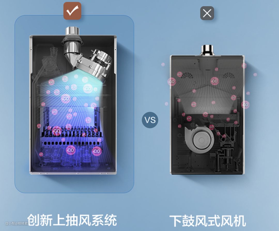 相比起传统的下鼓风式热水器,采用了上抽风系统,供气更稳定,排风更及时。