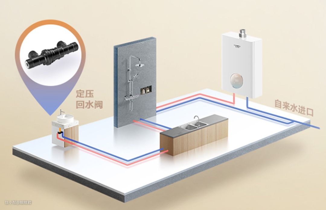 通过把用水远端的冷热水管通过一个单向回水阀连接起来,热水通过冷水管线回到热水器中循环加热,从而实现零冷水。
