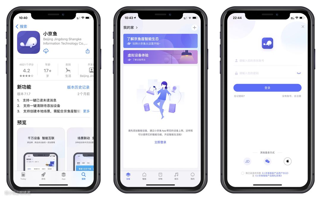 扫码通过app store下载安装京东“小京鱼”app,并使用京东帐号直接登录。