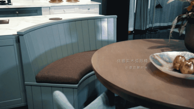▲实木弧形椅与吧台合二为一,大大节省厨房空间,带来了不一样的用餐体验,平时还可作为办公、娱乐、憩息的好场所,满足各种生活需求。
