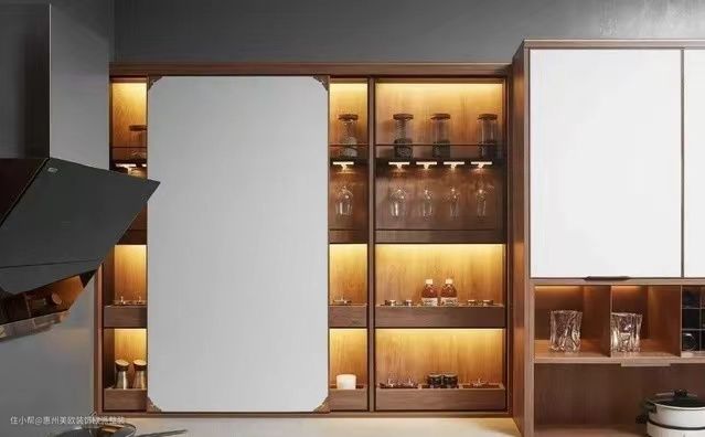 ▲玻璃柜可用于存放红酒及玻璃器皿,在灯光加持下,彰显精致优雅生活。