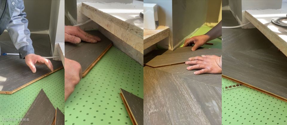 第五步,也是最考验地板安装师傅手艺的,地台平台和立面木地板45°对角安装。