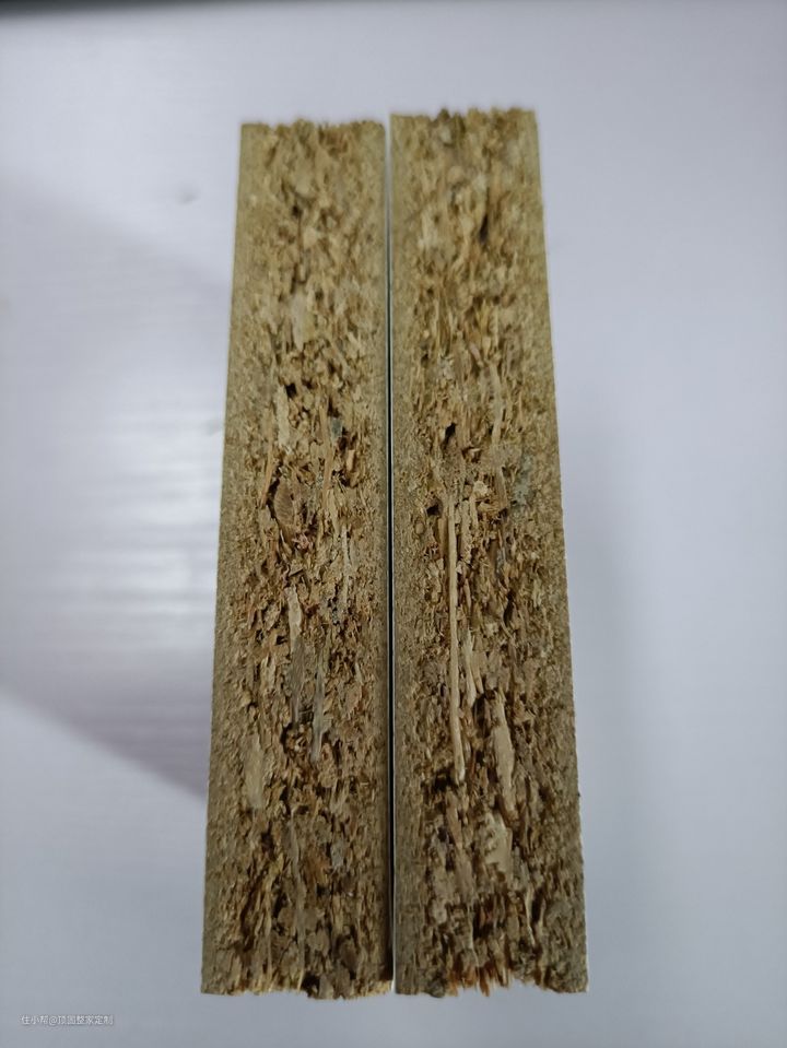 然后是颗粒板,是由木屑及木材边角料压制而成,一般中间为较大的木材边角料支撑板材的强度,外面两层是木屑等细颗粒提升触感和可塑性,相比于密度板,它的优势有以下几点: