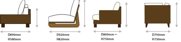 选沙发要兼顾空间内的视觉平衡,如图从左到右依次为:矮式、高背式、标准式、紧凑式。