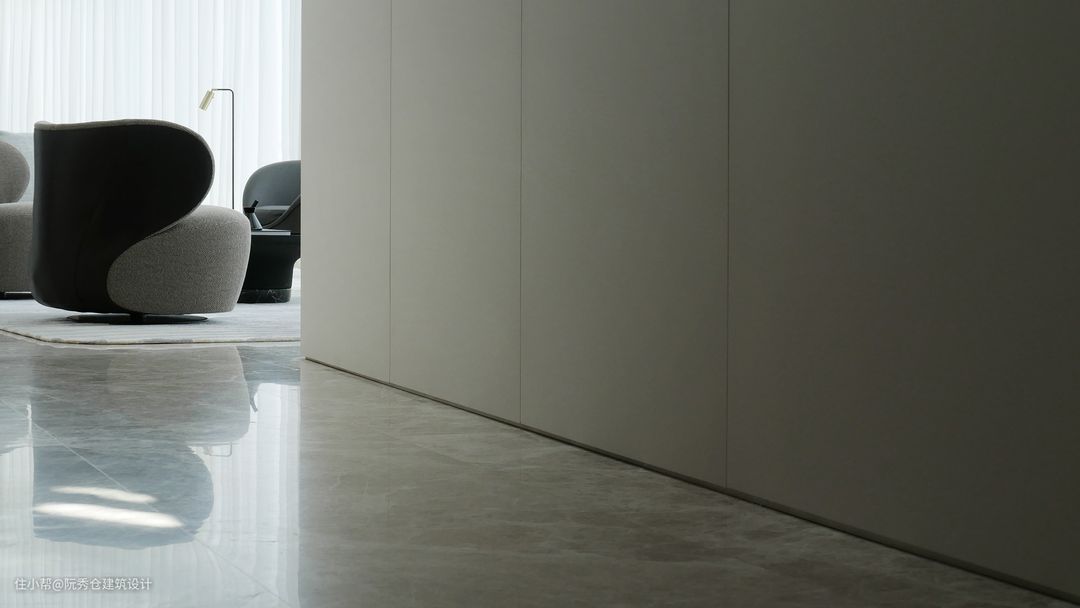 透明的白色窗帘使室内充满柔和的光线。为了满足客户对更宽敞的电梯大堂和入口自然采光的需求,设计师们用Rimadesio的有色Valeria滑动门替换了一个旋转门和格子,使光线能够穿透到更多的空间。