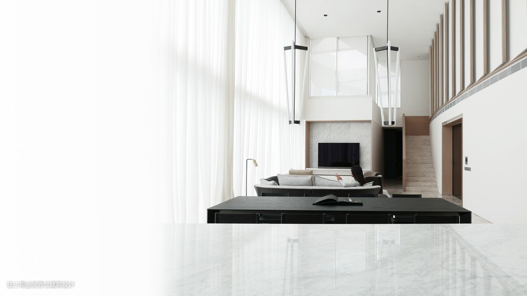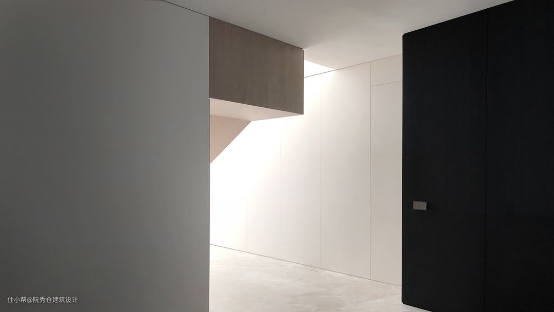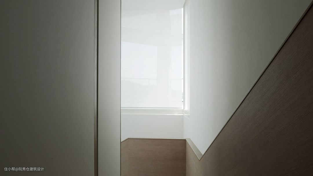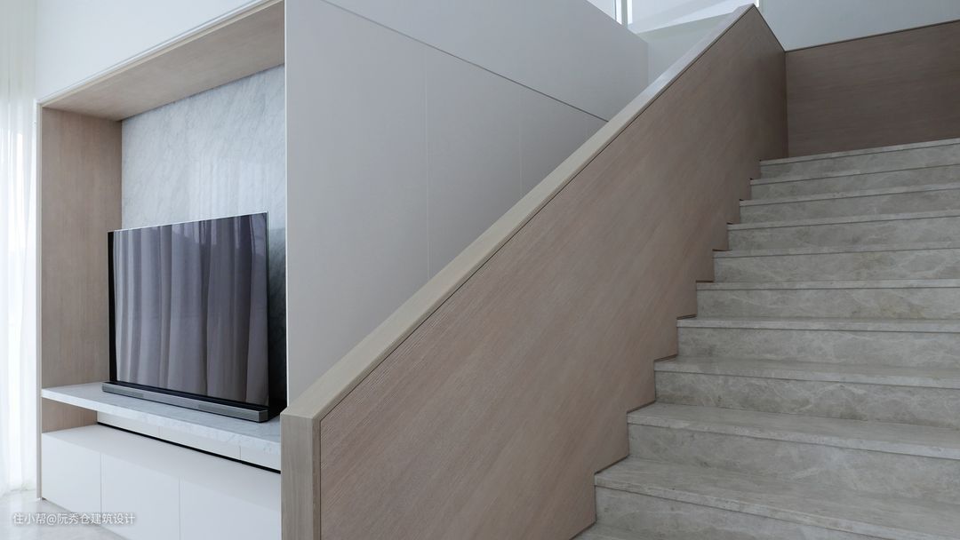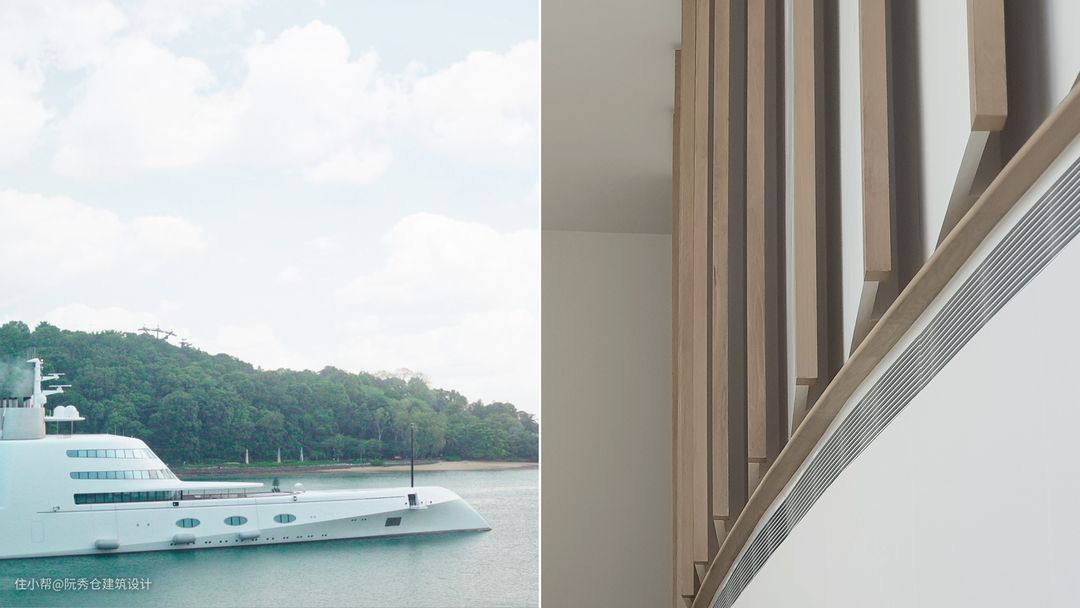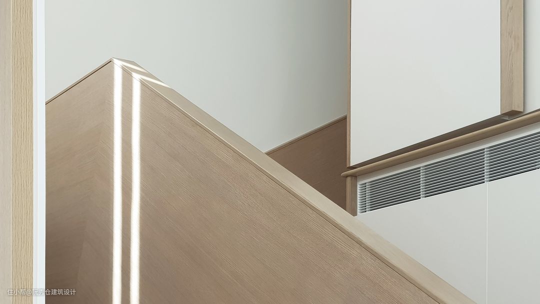 原本带有不锈钢扶手的玻璃楼梯被橡木栏杆所取代,为触摸提供了更多的舒适感。沿着起居室是一堵白色的鳍墙,抽象地模仿着船帆的运动,为空间注入了三维感。采用高品质纳米技术层压板,防指纹、防水防霉材料,考虑长期维护。