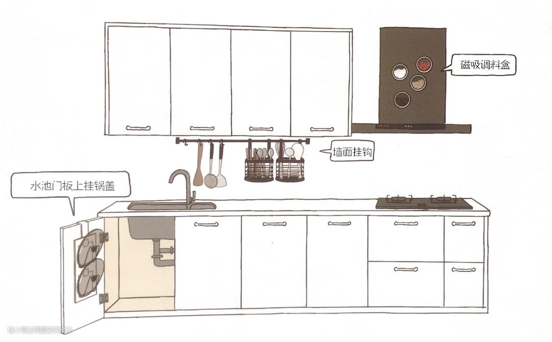 - 除了墙面可以布置挂钩和置物架以外,冰箱、抽油烟机、柜门等立面空间也可以充分利用起来。我的一位顾客,厨房面积不到4m2,只能安装一吊柜,但是抽油烟机上挂满了磁吸调料收纳盒,旁边的燃气壁挂炉上面是磁吸收纳架。