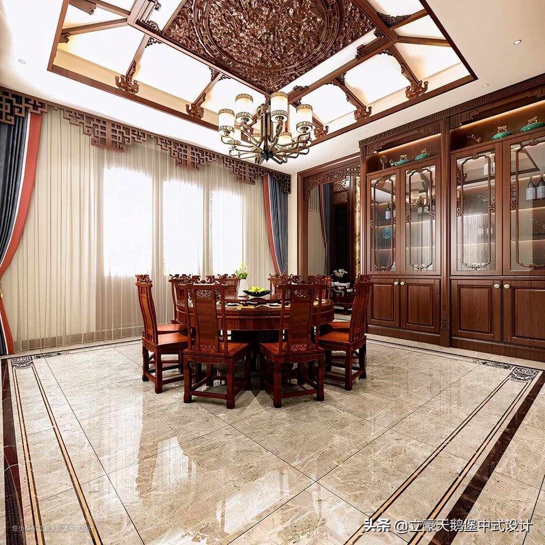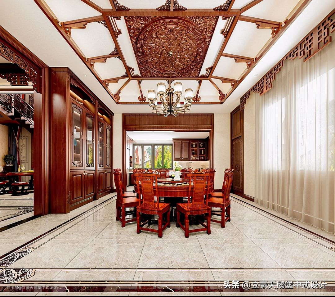 餐厅面积充足,主人家喜欢庄重古典的风格,所以这里的吊顶中式是实心繁复的,四周装饰简单的雕饰,状似兽类。窗前的窗帘头,仿照了窗格的样式做了简单的装饰。