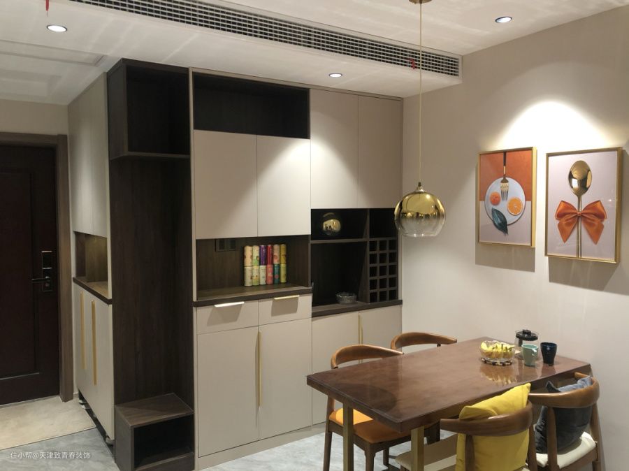 考虑到空间,鞋柜其实和餐具柜是一体的,基本形成L型,可以提供很大的收纳空间,正好利用空间。业主没有请设计师,全家人都很满意,很体贴。酒柜专门做了一个酒架,不用担心清理酒架,因为可以拆卸,布置了哈A方餐桌,占据了适当的空间,很多人需要移动位置,非常方便。安装的黄铜吊灯更加个性化,夜间照明亮度足够,光线更加柔和。