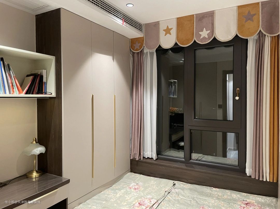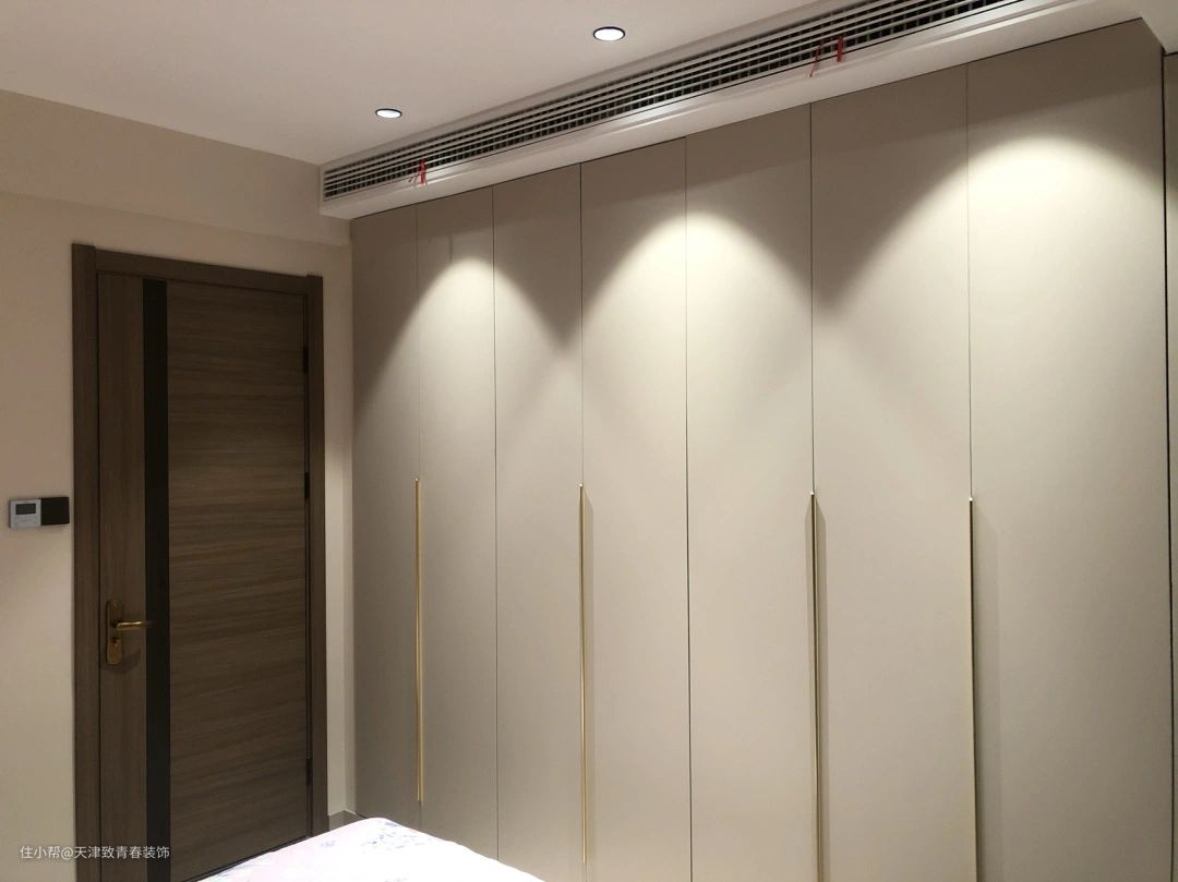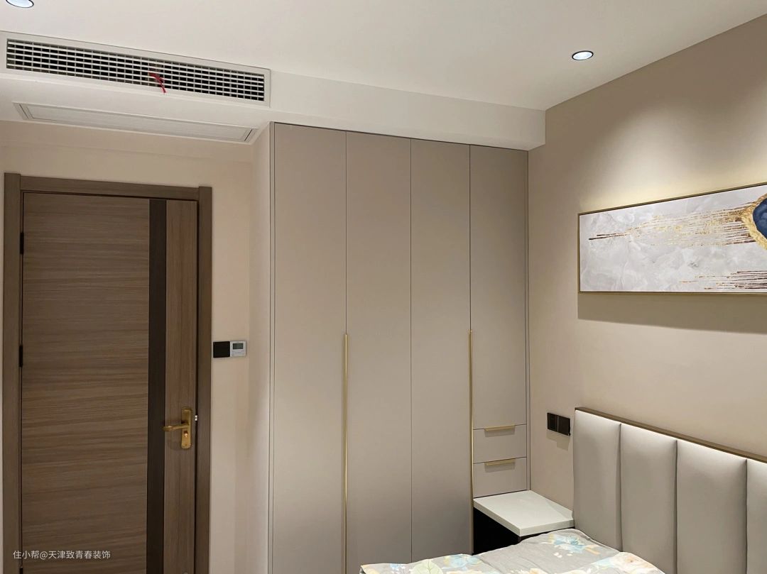 次卧卧室空间小,设计了嵌入式衣柜。木匠比较靠谱,家里的柜子很受欢迎。全家人能待在这里真是太幸福了。顶面装有中央空调,使用非常方便。