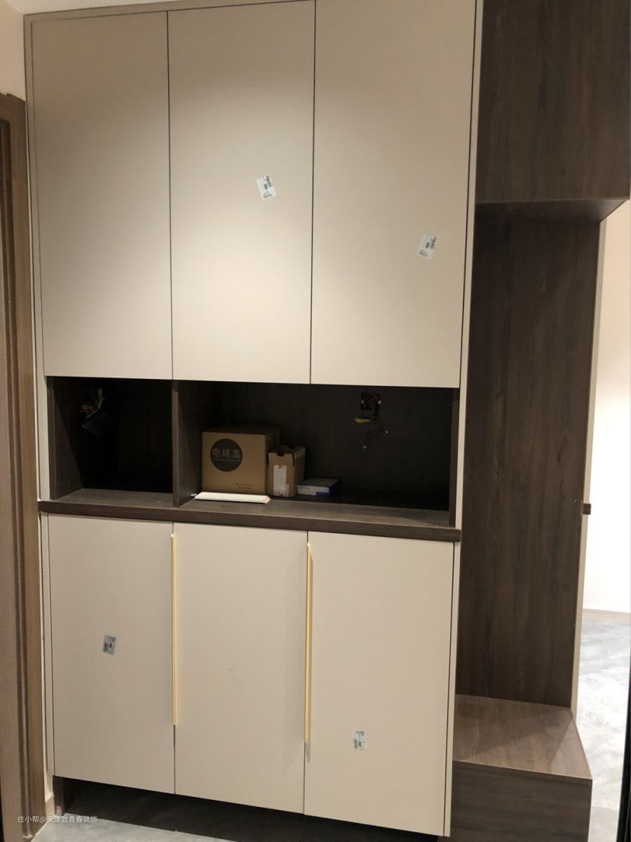 属于普通户型,从正门进来,有独立玄关。主人设计了一个鞋柜,上下层都有换鞋凳。全屋的柜子都是木匠当场打出来的,板子也比较靠谱。鞋柜中间的空地可以放一些小东西,底部可以放一些经常穿的鞋子,特别实用。鞋柜自带换鞋凳,方便坐和换鞋。真的很好。