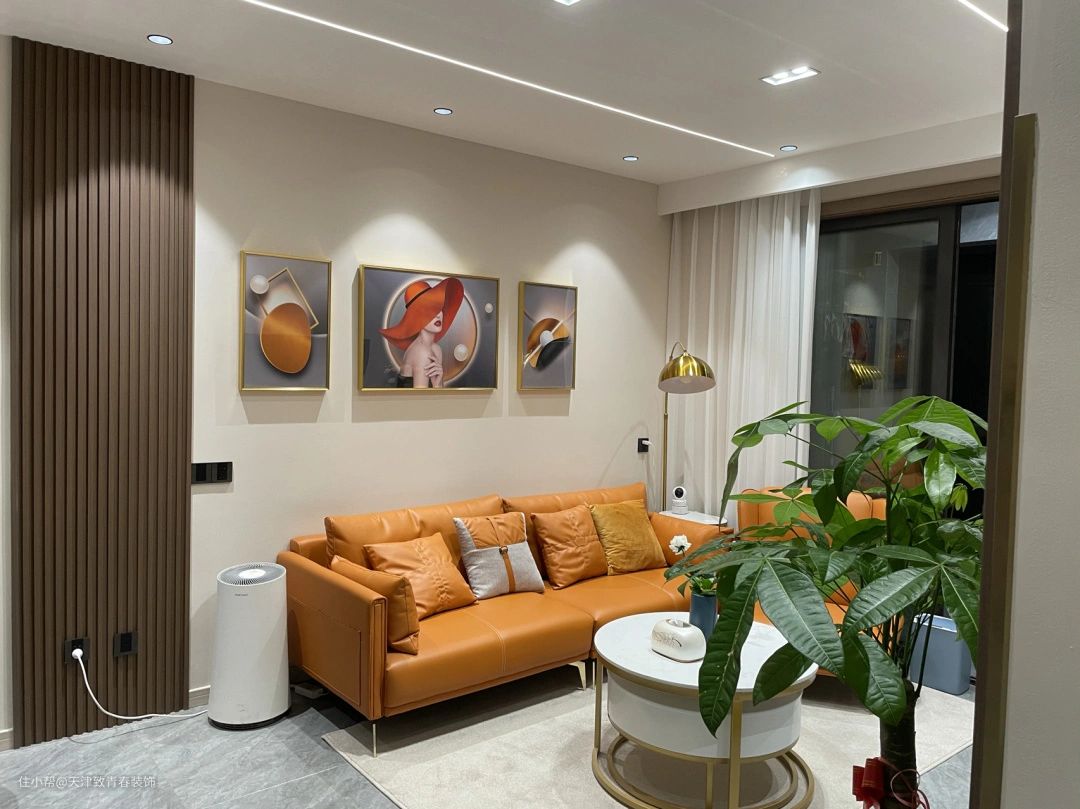 客厅区域左侧设有木格栅,实际上在视觉上把客厅和餐厅分开,视觉上更大气。三幅装饰画,整个空间完美搭配,协调美观。尤其是黄色的沙发坐起来很舒服,配色真的很好。中间的茶几是圆形的,很时尚。顶面无主灯设计简单,更大气。很多人喜欢无主灯的设计。
