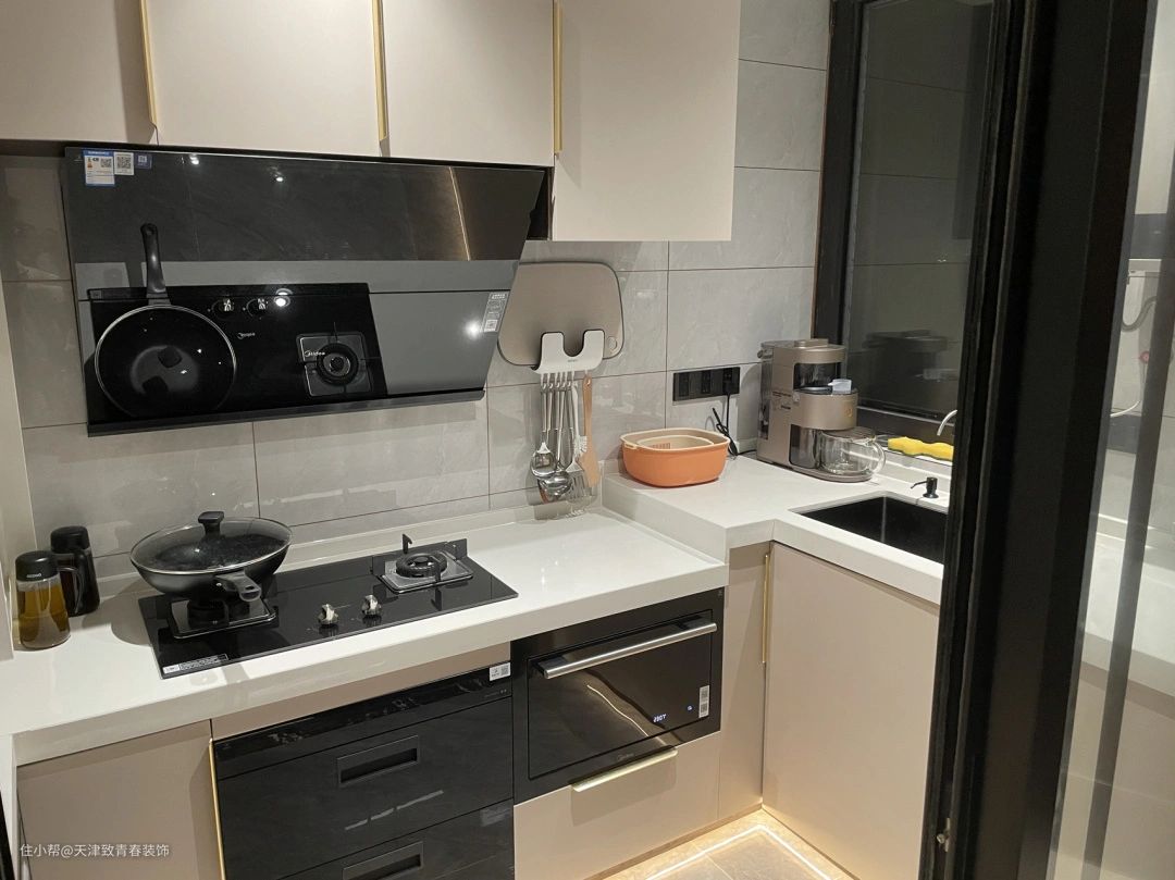 厨房的亮点之一是高台面和低台面橱柜的设计,使用非常方便,更符合人体工程学。同时布局形成“洗、切、炸”的顺序,使用非常方便。装个烤箱洗碗机太方便生活了。建议你设计高低台面的橱柜,比较实用。