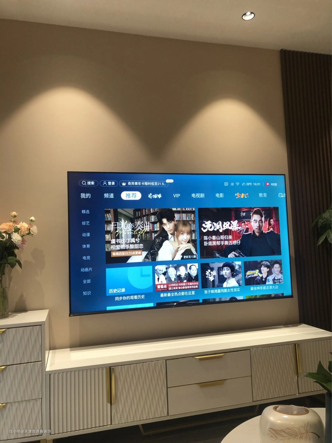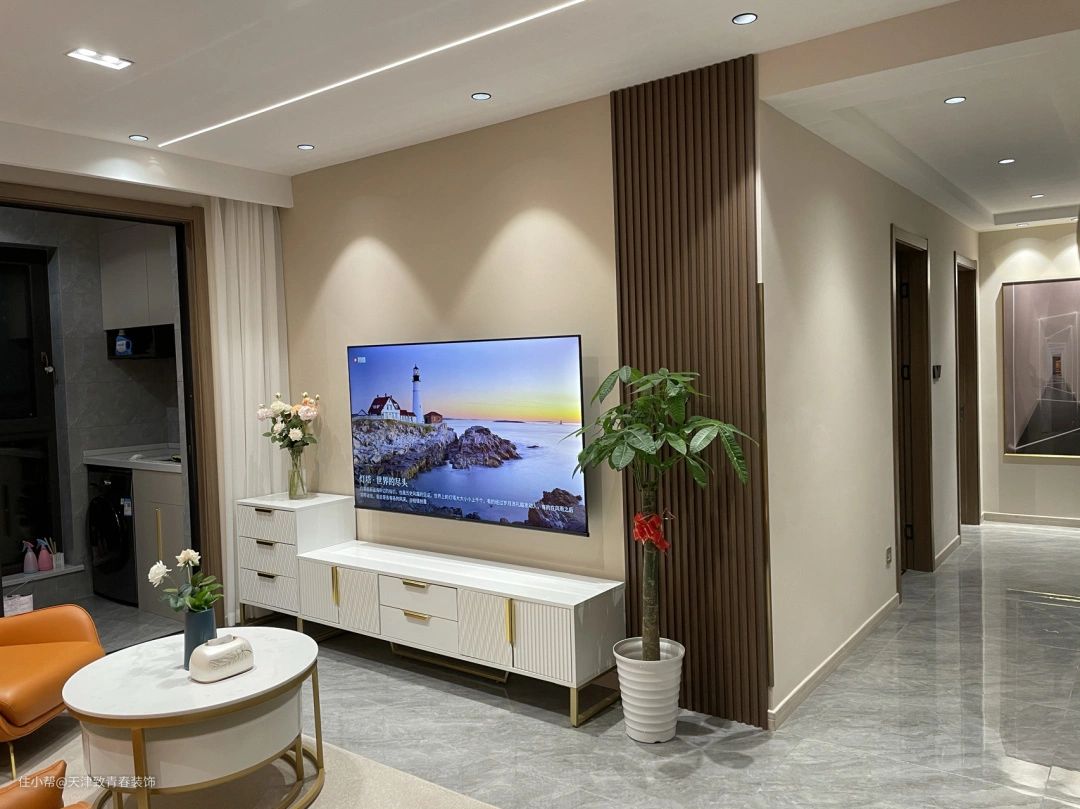 其实客厅电视背景墙和沙发背景墙是一个设计,空间比较小,所以设计合理,空间不会拥堵。最喜欢的是最上面网上购买的电视机,质量好,体积够大,智能。挂在墙上,效果更漂亮,可以为电视柜节省腾出更多空间。