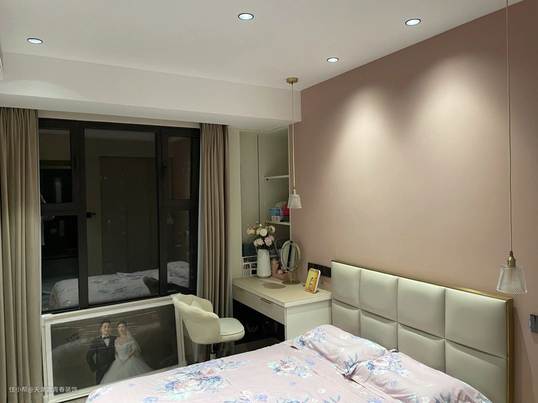 过道墙上的画,一开始选了很久,最后选了让家里满意的装饰画,才知道装饰效果好。地面铺瓷砖,非常耐脏,喜欢这种灰色调。主卧也是设计的没有主灯,真的不错。床边靠窗有一张梳妆台,非常方便女房主。真的很好。婚纱照之前没有挂在床头,不影响效果。