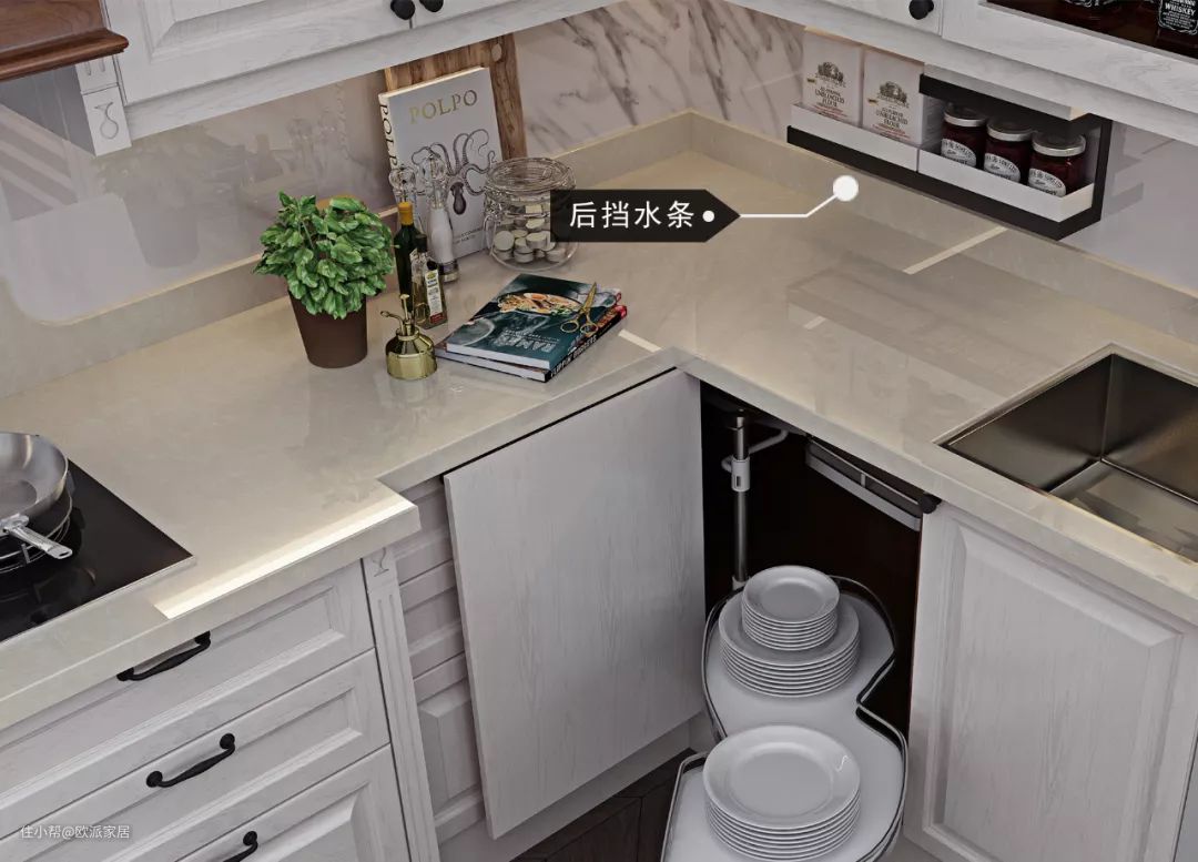 橱柜台面加后挡水条,主要有两个作用,其一是填补台面和墙面间的空隙,防止缝隙积水,避免墙面受潮发黑、损坏柜体;