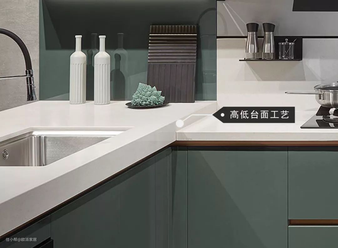 想让下厨更轻松,还可以采用高低台面设计,让水槽位和灶台位形成一个高度差,水槽位略高于灶台位,一般10cm左右比较合适,这样洗菜、刷碗时不用弯腰,炒菜时也无须架着胳膊,大大提升下厨体验。