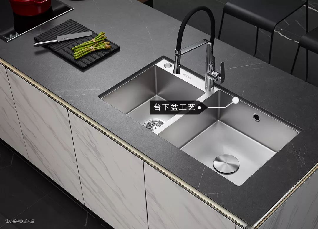 但台下盆需要注意承重问题,建议选择品牌商家。欧派的台下盆工艺技术纯熟,14道科学工序工艺保障产品质量,采用全金属星盆扣件,横向、纵向垫条均匀分解台面压力,受力是台上盆的两倍,大大增加承重。