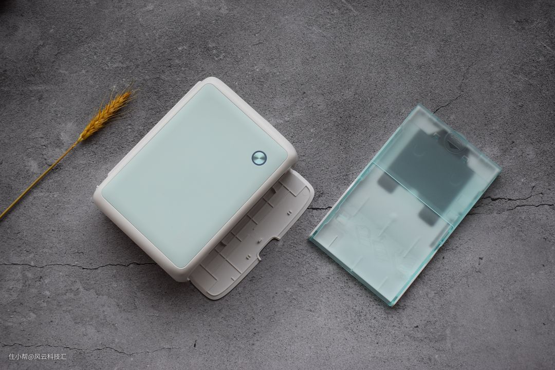 汉印照片打印机尺寸约185*126*65mm,重量1000g左右,小巧精致便于携带,不占空间摆在家居任一隅也不显突兀。它采用无棱角设计,整体线条圆润,有薄荷绿、珊瑚橙、月光灰三种时尚配色,我选了看起来很是小清新的薄荷绿,唯一的控制按钮和电源指示灯位于机身顶端右下角,简单易操作,即使是孩子和老人都极易上手。