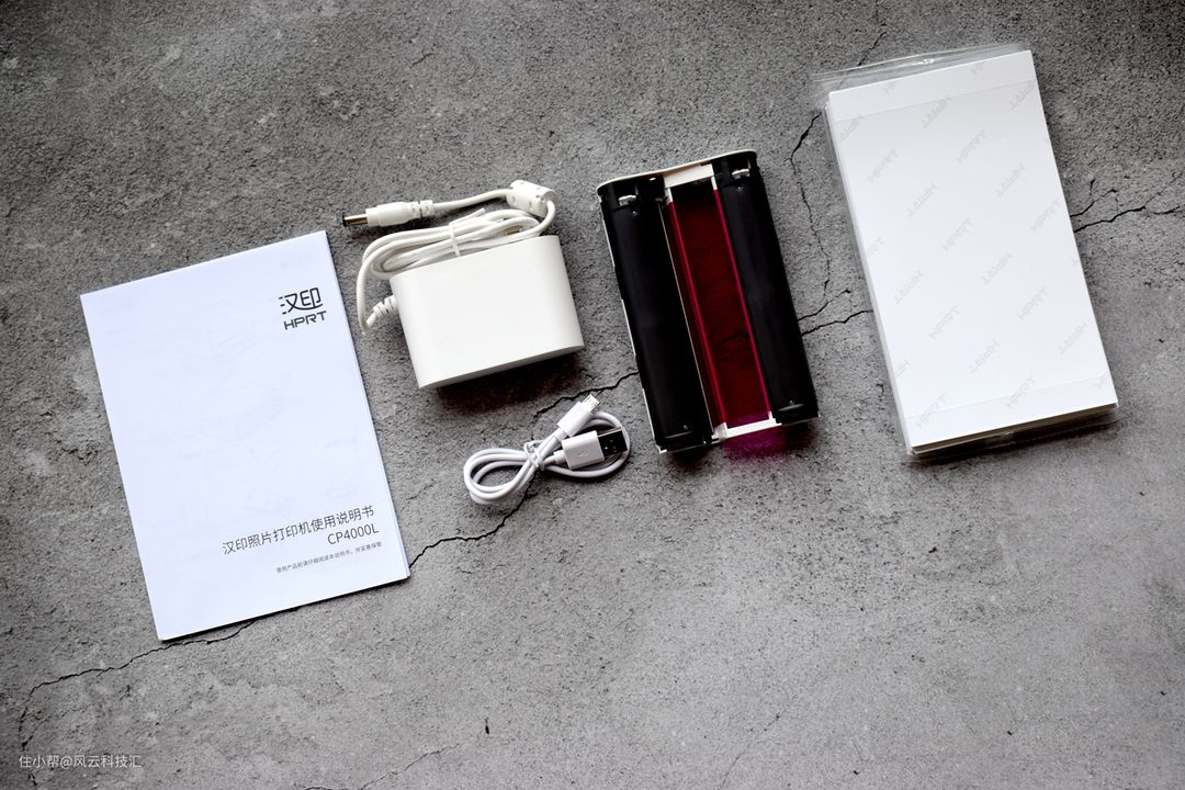 包装盒沉甸甸的,迫不及待的打开,里面井然有序的装着汉印照片打印机和各种配件。