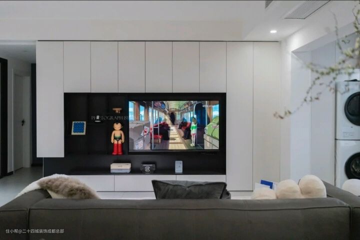 3、因为家里面是横厅,为了将左侧过道尽可能地留宽,电视没有设计挂在中间往右侧挪动了大概400mm左右,电视左侧做三列格子放装饰品,选好电视上下左右各留50-100mm的间隙留出电视位置。