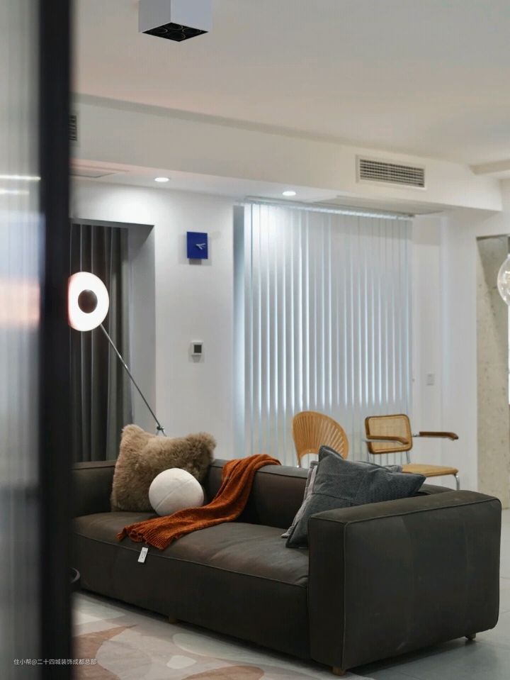 客厅的这款沙发整体很力挺,全牛皮的质感也很好,对于极简风格来说,简约的线条、黑白的色彩,需要一个很突出的单品与之相呼应,像是地毯、抱枕、钓鱼灯都是围绕沙发进行搭配的。
