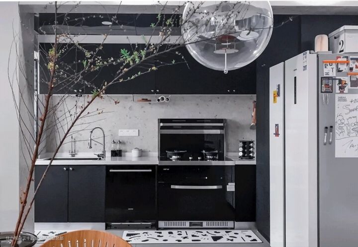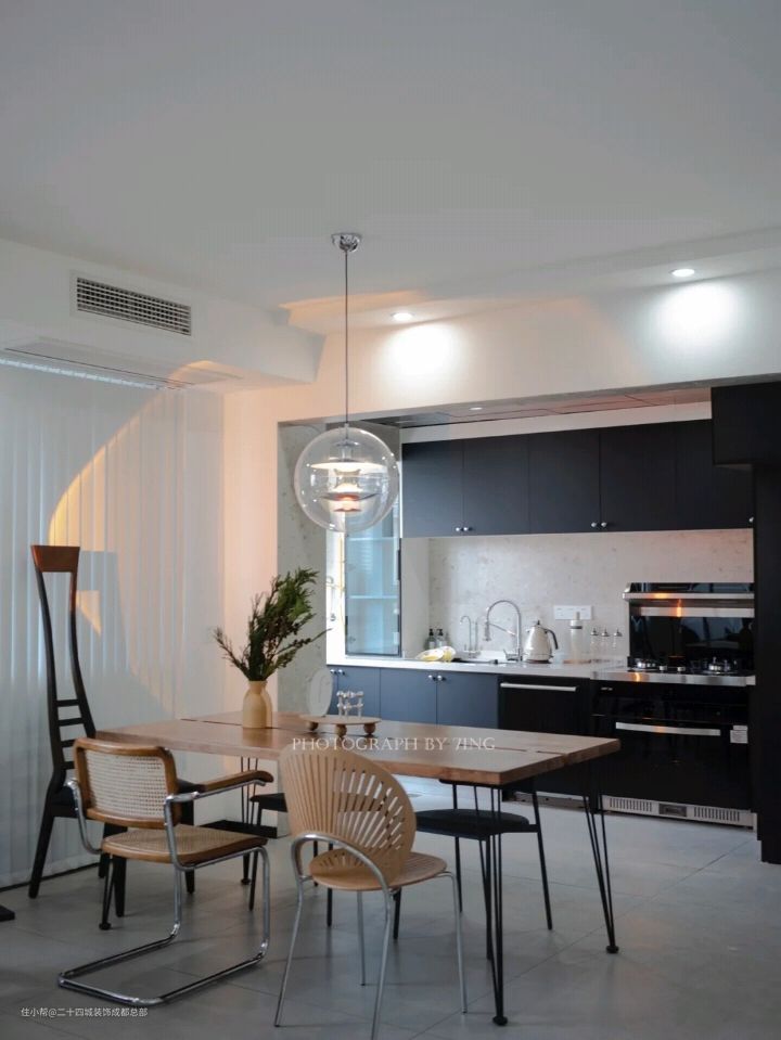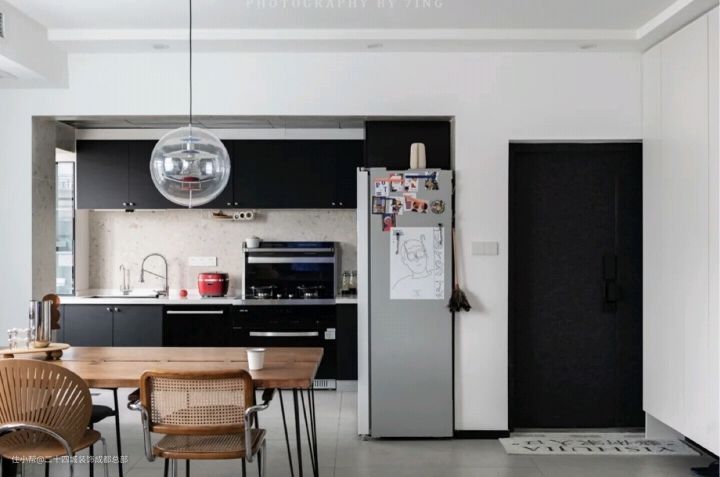 在装修前确定风格是很重要的事情,他家是宽为5.1米,长为6.8米的横厅,属于稍微有些方正的户型,厨房也刚好和餐厅在一个水平位,思路就是开放式厨房,将6.8米并不长的横厅延伸到厨房,这样使得客厅显得更长一些,餐桌也能顺势往厨房靠近,给客厅留出更宽的空间。