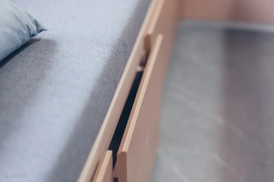床尾的楼梯也是暗藏玄机,每个台阶下都隐藏着大抽屉,用于收纳。
