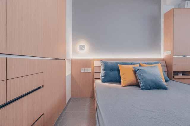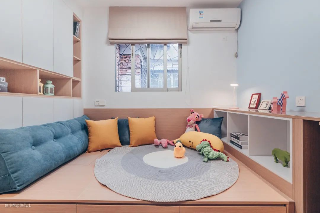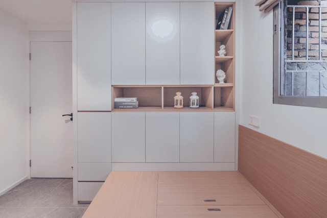 榻榻米床头处,是整墙的通顶收纳柜,收纳能力相当强!
