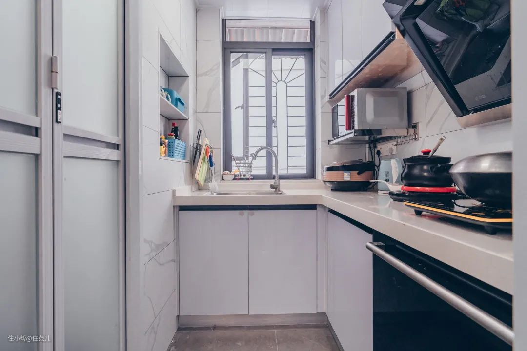 除了L型的地柜以及吊柜,厨房的收纳还有个小心机,在另一侧的墙面上凿开了一个壁龛,放些平常做饭的调料,拿取非常方便。