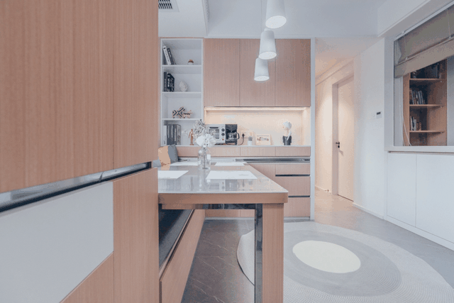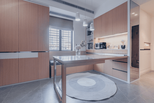 1800*800mm的大餐桌与餐边柜通过滑轨连接,可以严丝合缝收进卡座缝隙中。