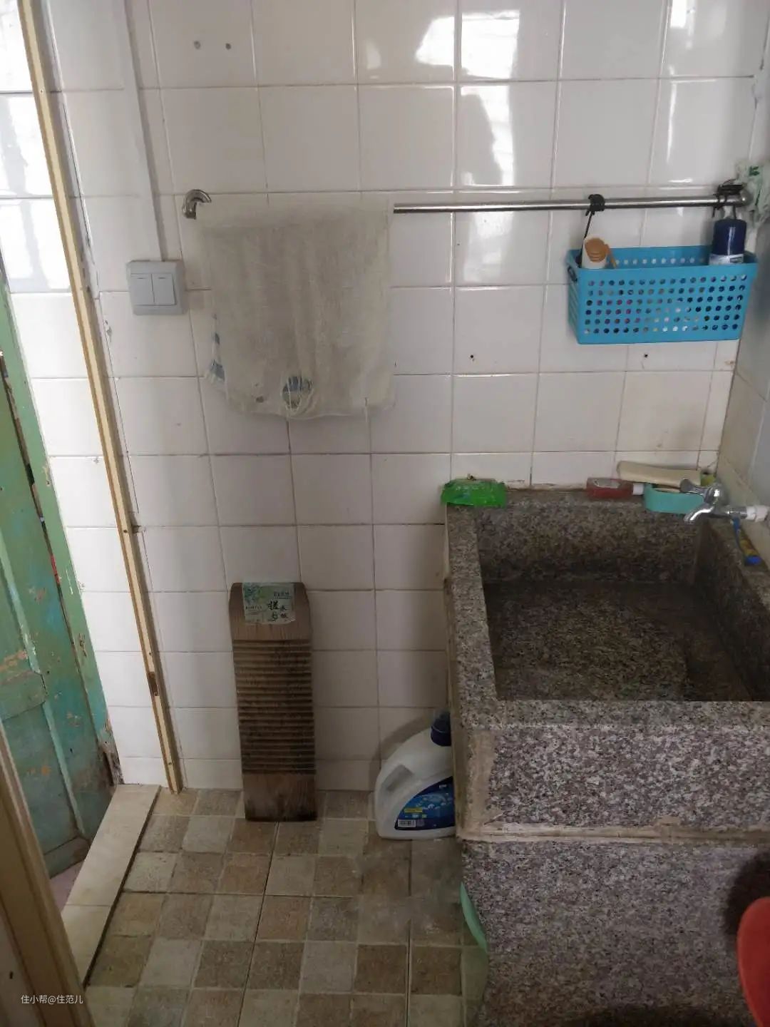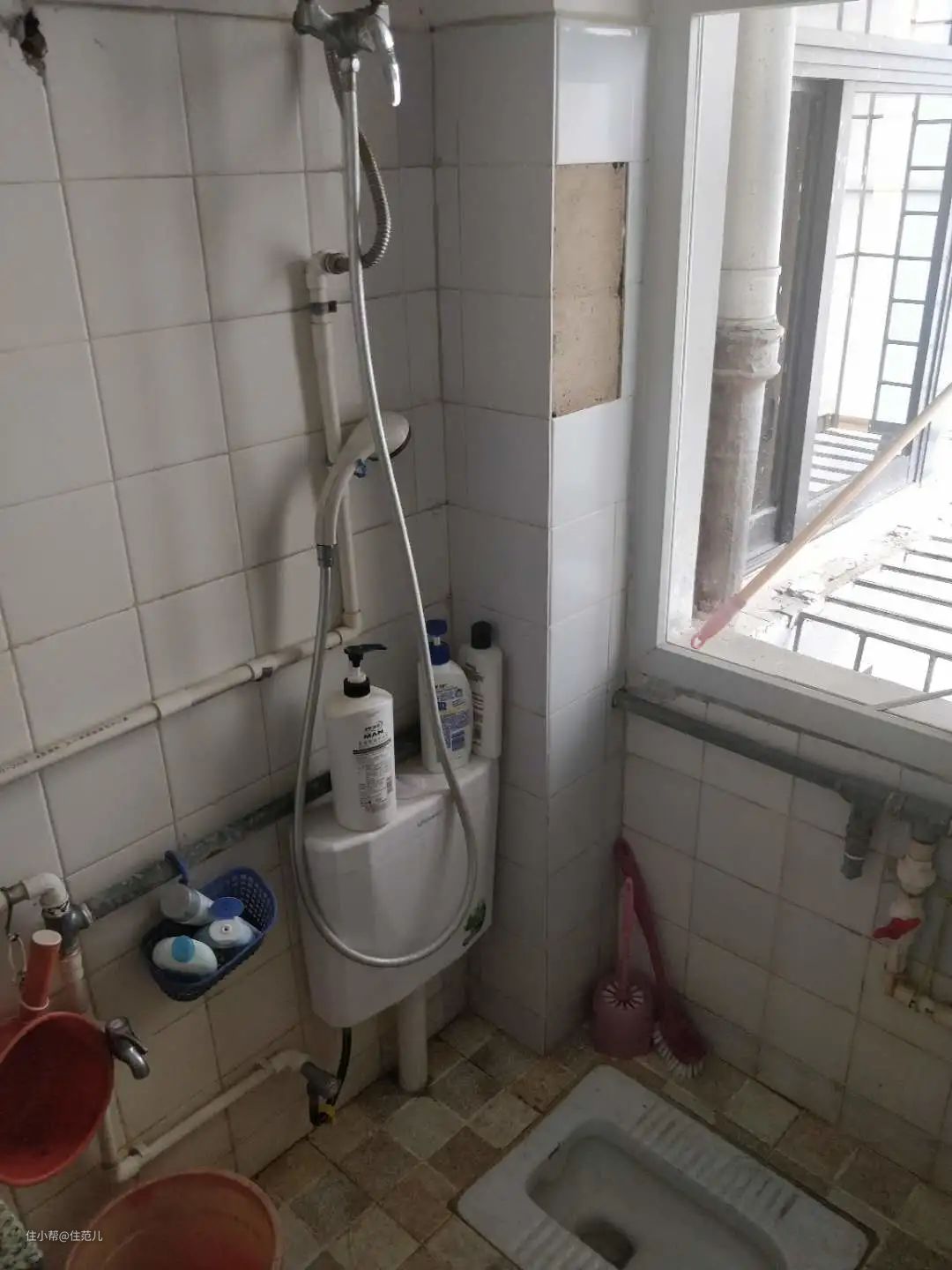 空间小,只有3㎡,连放东西地方都没有,原来都是把洗浴用品装在小篮子里,挂毛巾架上。