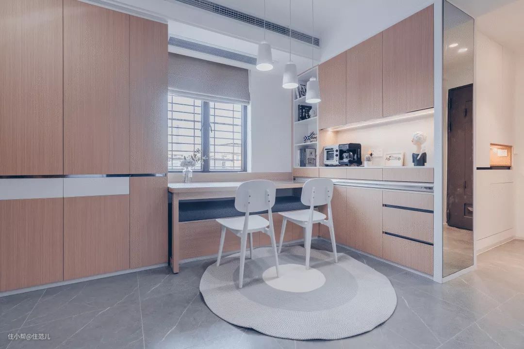 由于空间太小,同时为给孩子营造好的学习环境,就放弃了以电视为中心的传统客厅模式,打造出一个多功能的家庭中心区域。