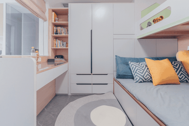 床头侧,是整墙的书柜连衣柜设计,一直延伸到高低床处。