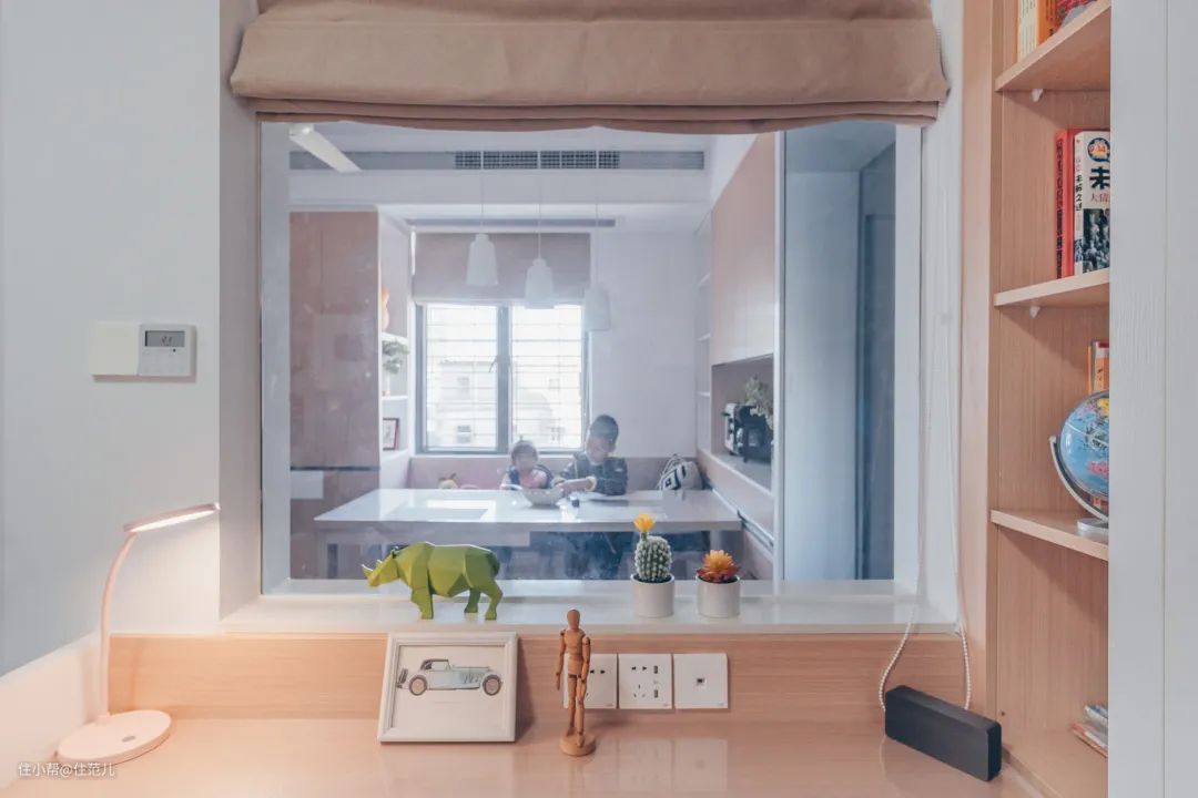书桌与衣柜连接,正对客厅,设计师特地在这里开了个窗户,用10mm的透明玻璃做隔断。