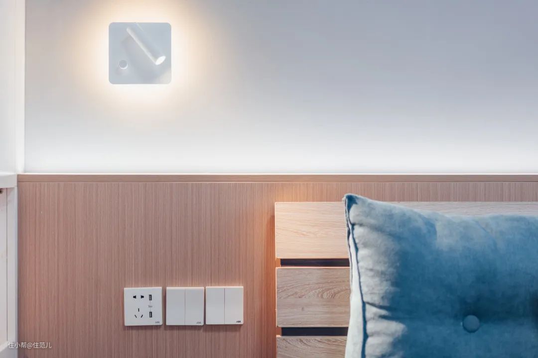 设计师用一个简单的层板替换掉抽屉,作简单的床头置物架,比抽屉实用多了!看到这,不得不佩服设计师的巧思之强,水平之高。