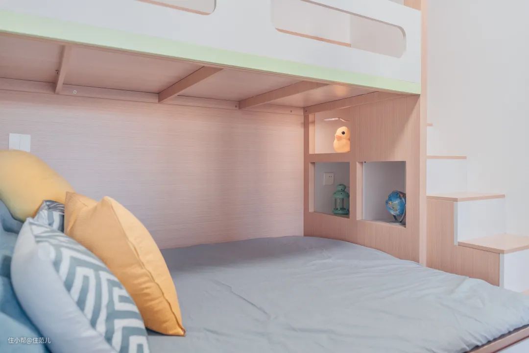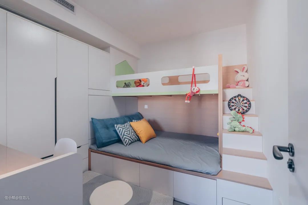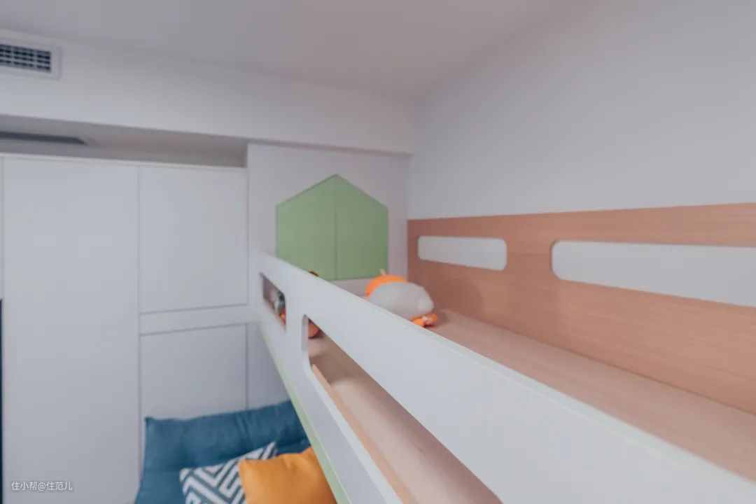 设计师还在上床处的柜体做了绿色的小房子,生动又充满童真。