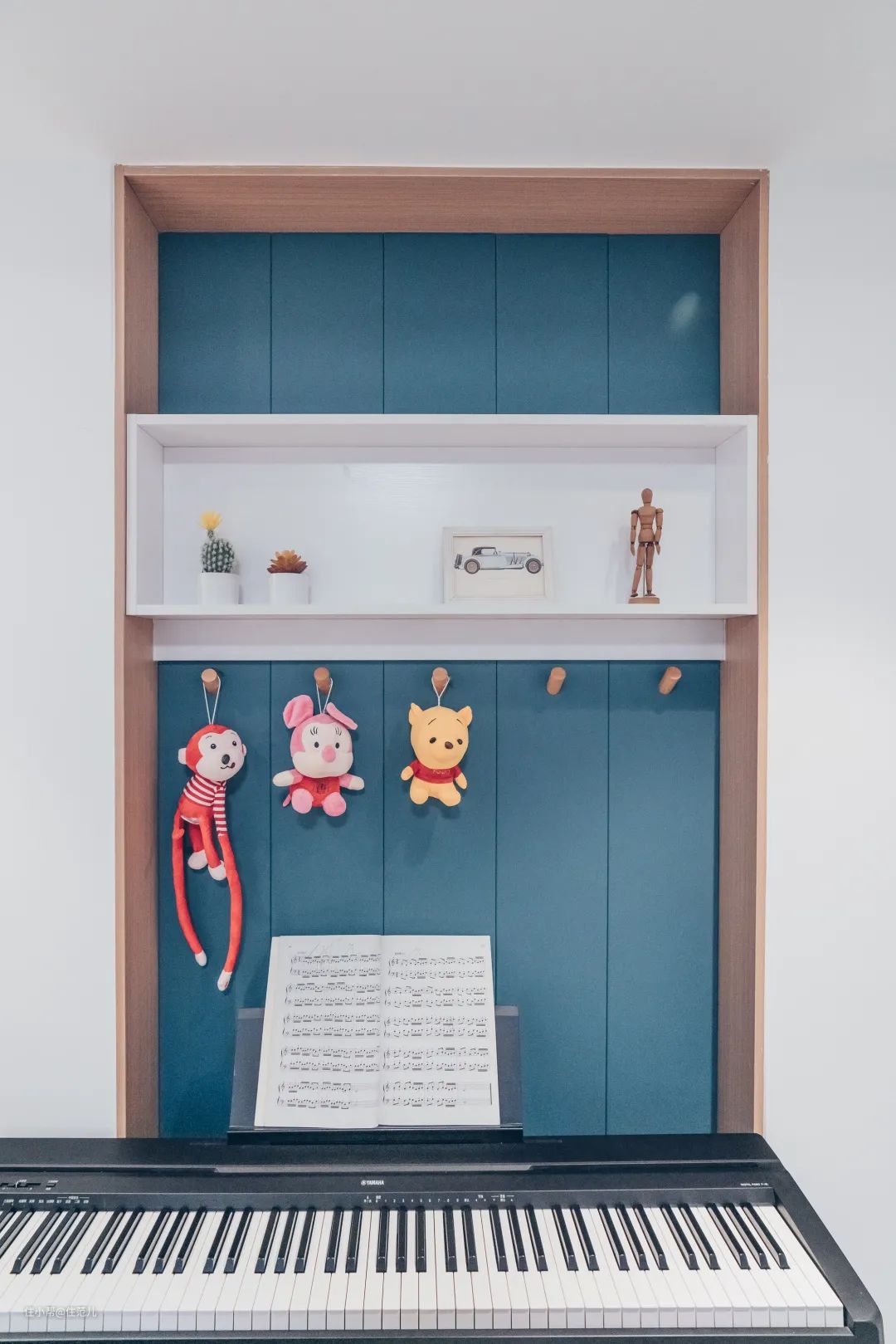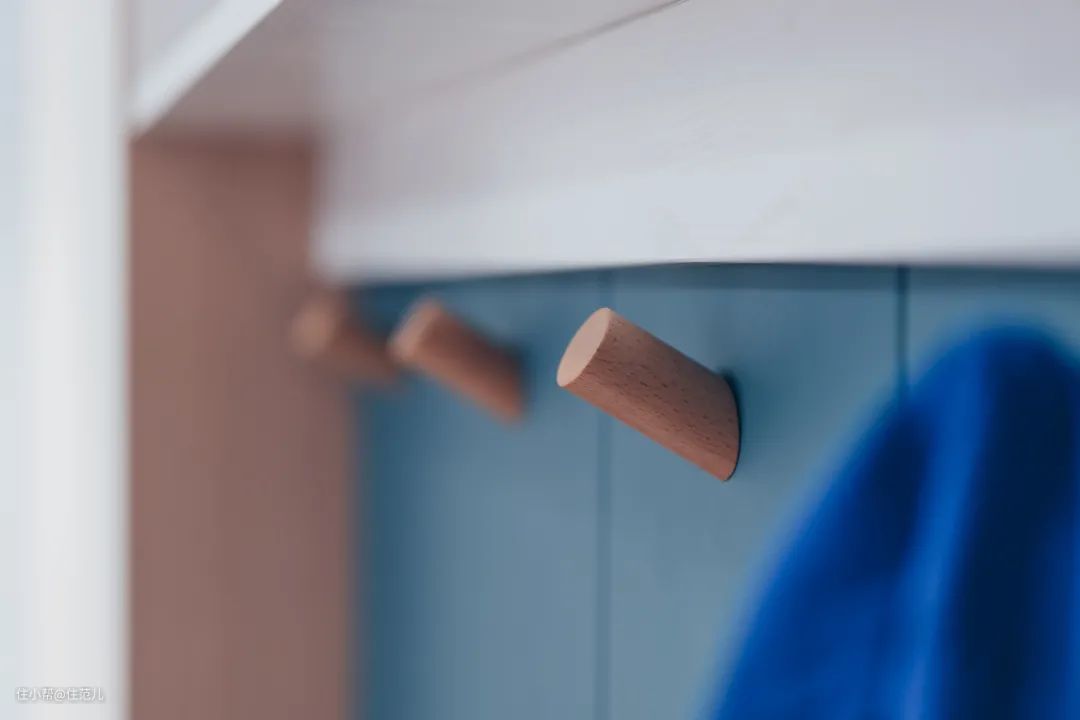 墨绿色木质隔板为底,中间是悬空白色置物架,陈列着哥哥喜爱的物件,下方是柯先生从网上淘来的挂钩,挂些小玩偶,充满童趣。