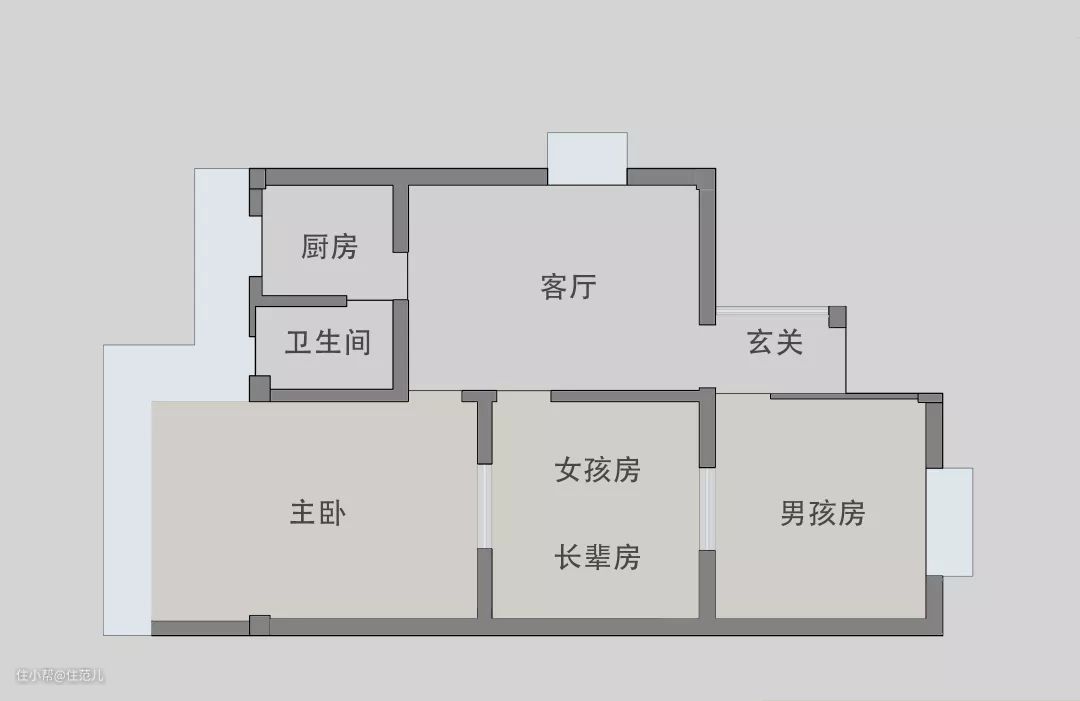 女孩房在中间,没有窗,是个标准的暗间。方方正正2950*3090mm,面积不过11㎡。