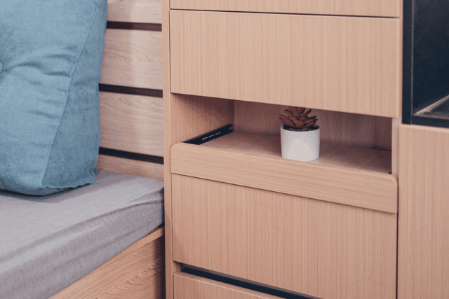 房间左侧的衣柜下方空间,设计师做了个活动柜体,轻轻往外拉,就成了一个标准的床头柜,还带有两个抽屉。