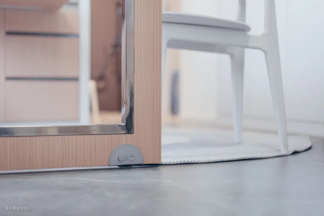 餐边柜滑轨上方也没有浪费,设计了一排抽屉,用于收纳临时用品,细节拿捏得死死的。